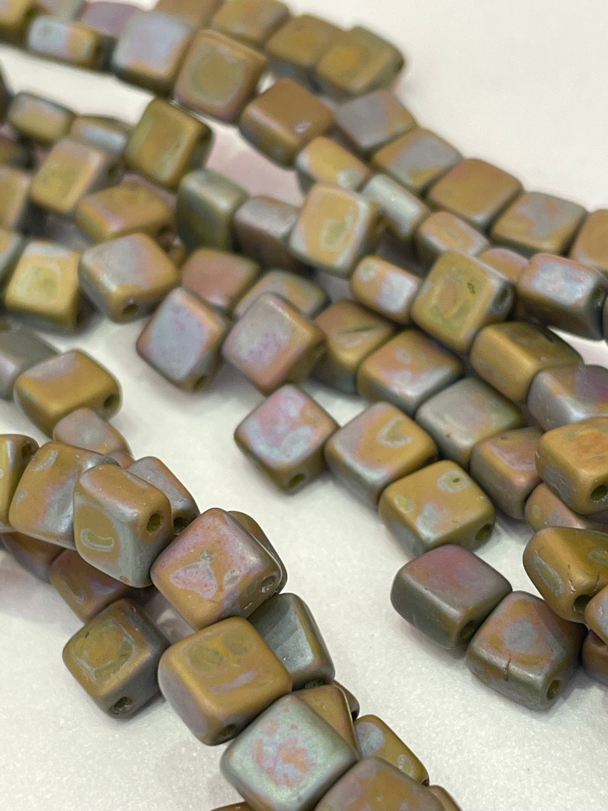 5mm 2-hole flat tile beads in green nebula with a matte finish. Sold by the strand of 30 beads. Made in the Czech Republic.