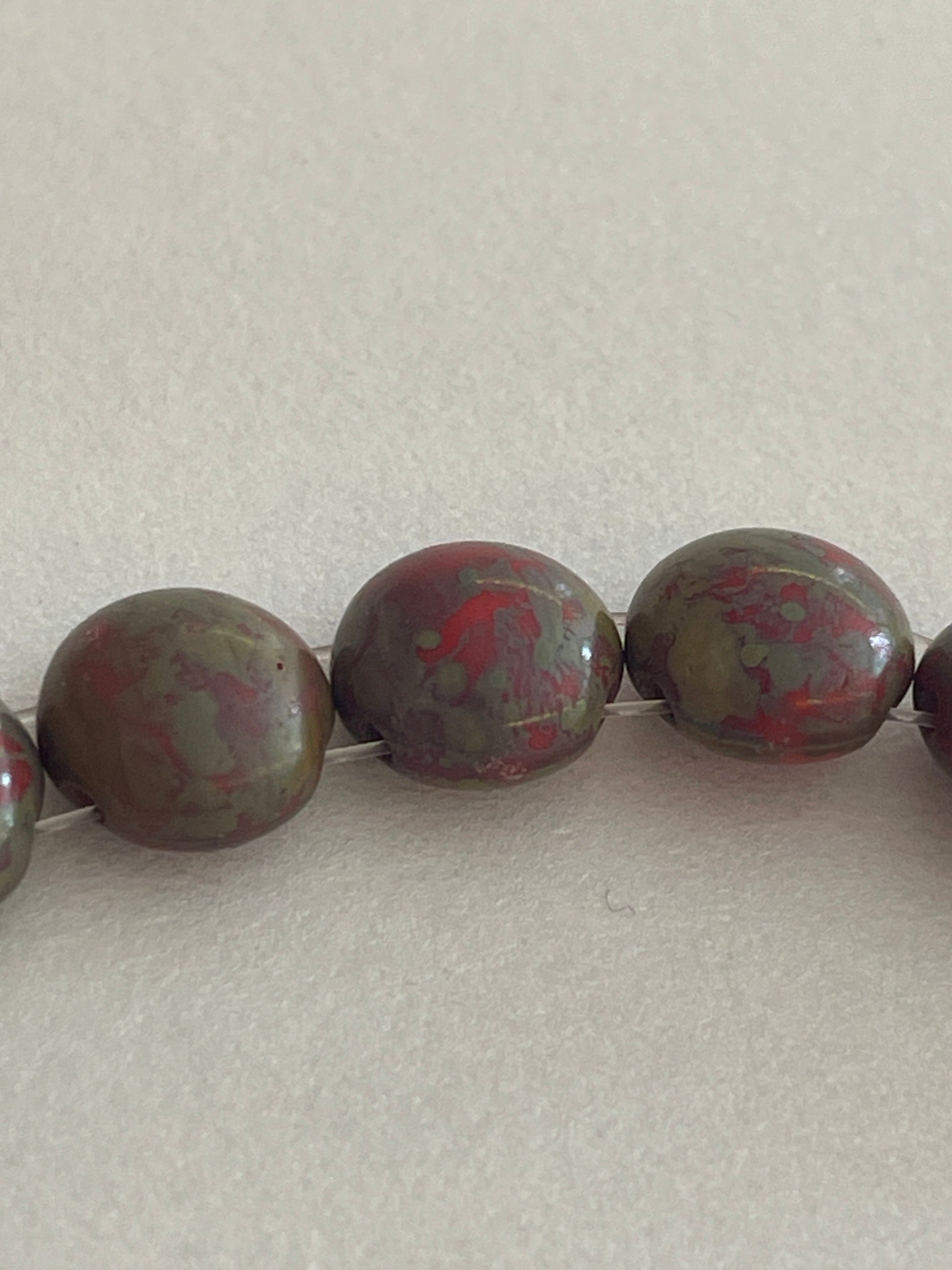 20 bead strand of glass Candy beads in red with a travertine finish. These two hole glass beads are flat on one side and domed on the other. Made in the Czech Republic by Preciosa.