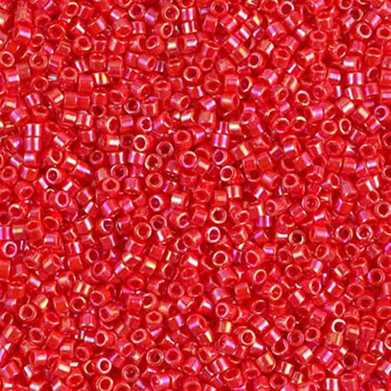 5 gram package of size 11 Miyuki Delica beads in opaque light Siam with an Aurora Borealis (AB) finish. Approximately 1000 beads.